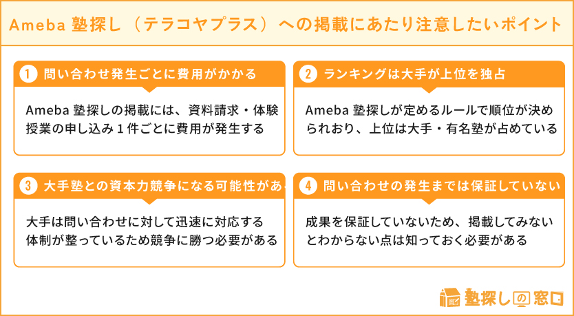 Ameba塾探しへの掲載は、塾にとって魅力的な施策でしょう。ただし、掲載を決定する前に押さえておきたい注意点が4つあります。それぞれを詳しく解説します。