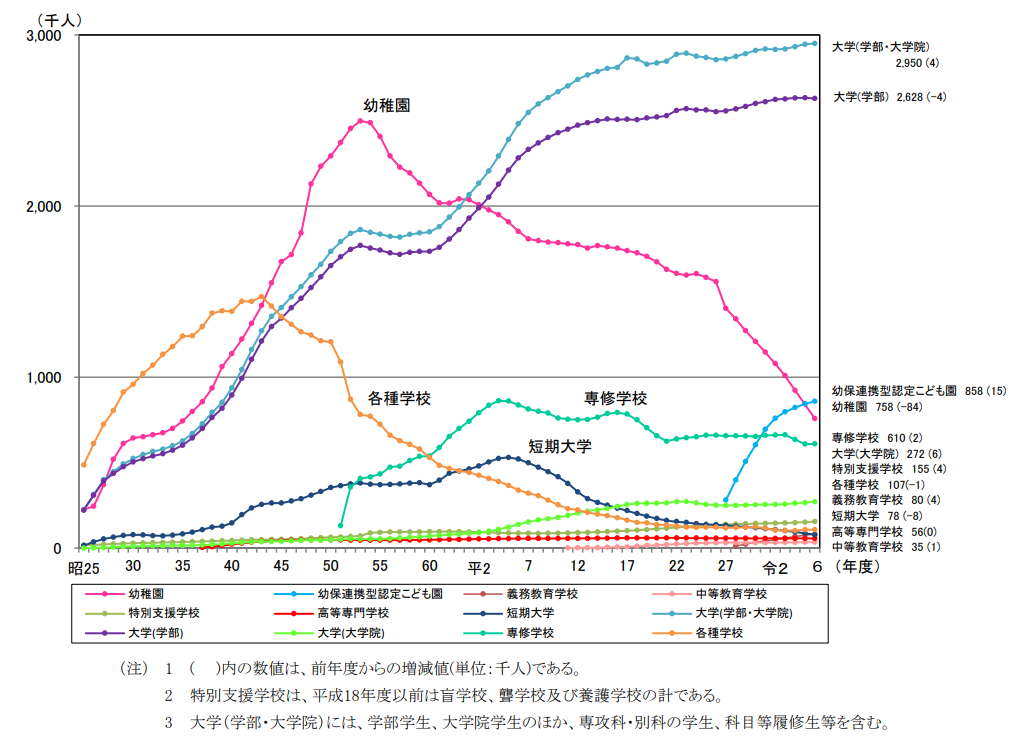 予備校は、学校制度上では専修学校/各種学校に分類されます。専修学校の在籍者数は横ばいですが、各種学校の生徒数は激減しています。