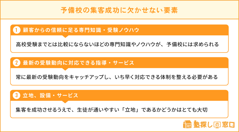 そもそも、予備校の集客を成功させるためには、満たしておかなくてはならない前提条件が3つあります。1つでも欠けている要素があれば、対策が必要です。