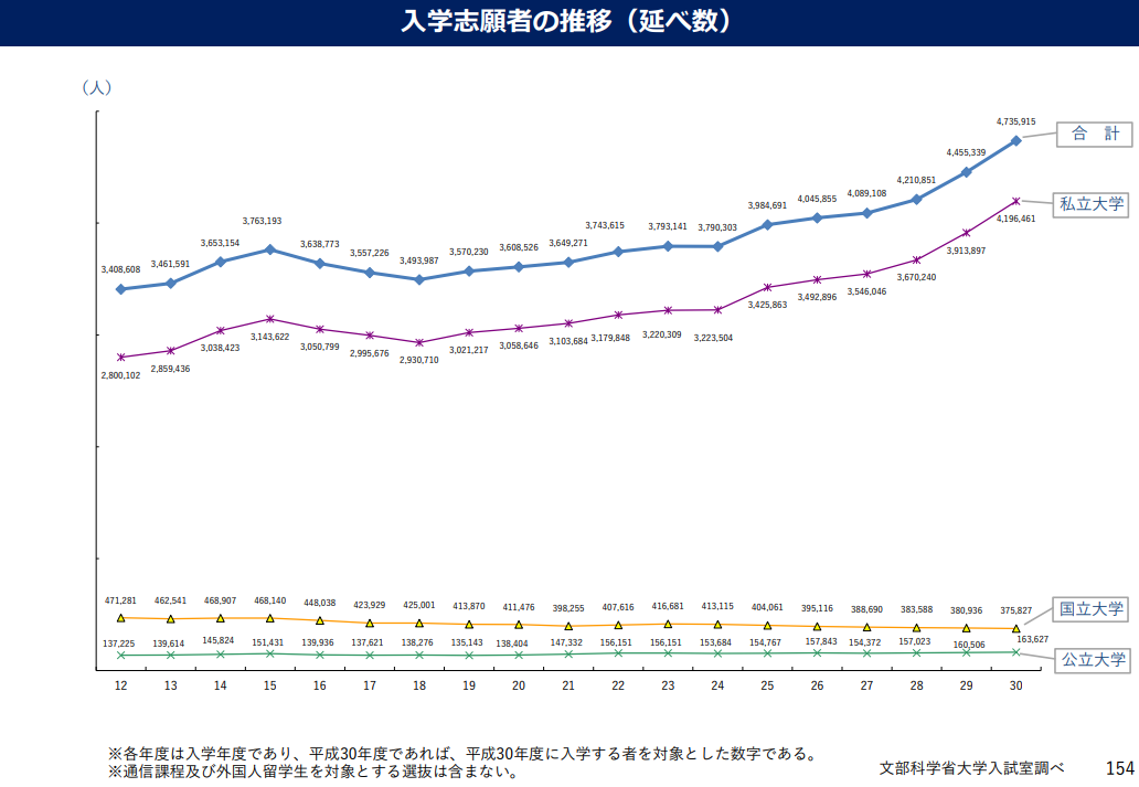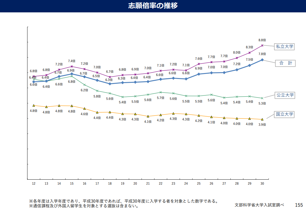 同様に、大学の倍率も私立大学は右肩上がりに伸びており、国公立大学でも横ばい~微減を維持しています。