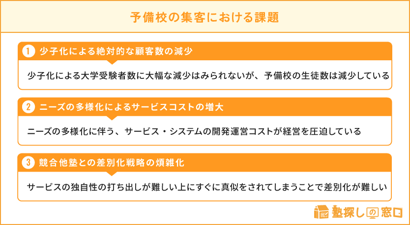 効果的な集客戦略立案は、予備校が置かれる現状・直面する課題を正しく押さえてこそ可能になります。はじめに、予備校業界の課題を3つの観点から考えます。