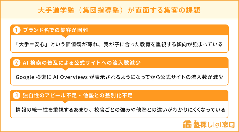 いま、大手の進学塾・集団指導塾が直面する集客上の課題は、3つのポイントに整理できます。