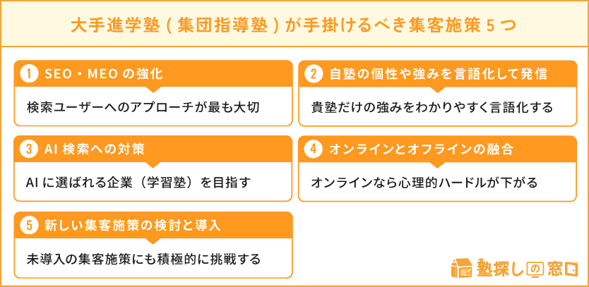 大手の進学塾や集団指導塾が、難化する集客を成功に導くために取り組むべき施策は、5つあります。それぞれの要点を詳しく解説します。