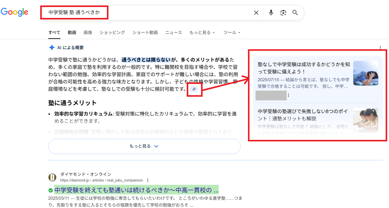AI Overviewsの要約は、あくまで「要約」です。要約には入らずとも、入塾を判断する上で大切になる情報も多々あります。詳細な分析や塾ならではの専門的な見解、体験談、独自データなど、公式サイトを見なければ得られない付加価値の高い情報を発信します。