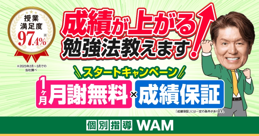 「その生徒さんに合った正しい学習方法で努力すれば、必ず成績は上がる」という信念のもとで実績を上げてきたWAM。だから、「成績が上がる」ことを保証した保証制度があり、一定期間で成績が伸びなければ返金が可能です(保証制度適用には条件があるため、詳しくはお問合せください)。