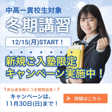11月30日(日)までに、12月15日(月)から開催される冬期講習にお申し込みいただいた方を対象に、冬期講習の料金が割引になるキャンペーンを実施いたします。