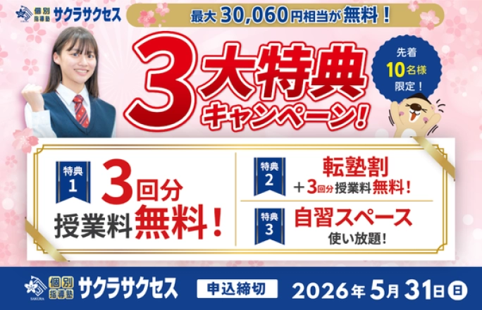 ※特典①②はこれまでサクラサクセスにご通塾いただいたことがある方は適用外となります。