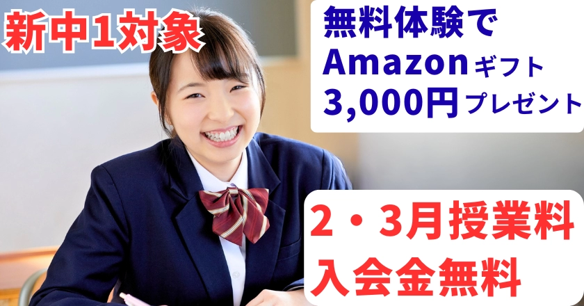 【新中1】2月3月授業無料+入会金無料+無料体験でアマギフ3,000円