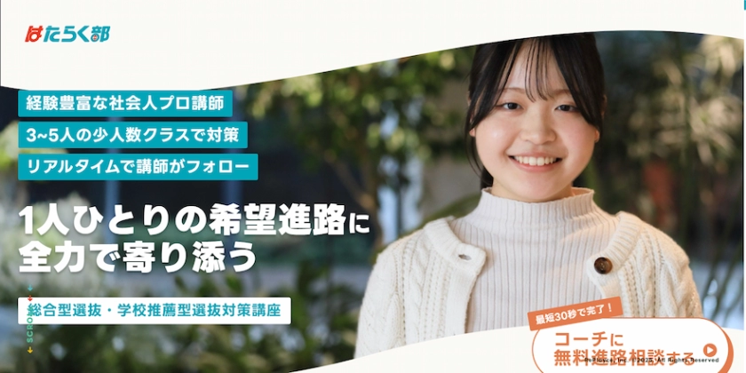 大学合格だけではなく、その先の将来を見据えて「先生」と「生徒」ではなく、道を切り開く学生の良き伴走者としてサポートを実施します!キャリア教育をやってきたはたらく部だからこそ実践できる総合型選抜対策を提供します。
