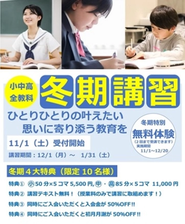 ●苦手克服コース 「どこから復習したらよいか分からない」とお悩みの方。この冬で解決しませんか?授業はスモールステップで進めていきますので、しっかりと基礎力が定着していきます。 ●高校受験準備コース(1、2年生) 先取学習をすることで、学校の授業が復習になって学校の授業も受けやすくなります。まずは学校の成績アップを達成し、教科書内容を早く終えることで受験対策も充実させます。 ●高校受験対策コース(3年生) 志望校合格に向けて得点力アップ・面接対策・作文対策を行います。 |