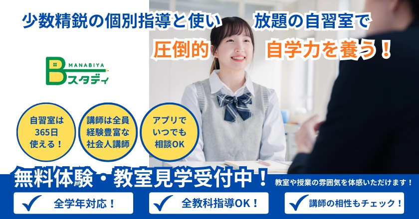 Bースタディは個人塾なので、新規・既存問わず様々なお客様のご要望に柔軟対応可能です!例えば、教科ごとの体験授業を受けたいという場合は、受講いただくことが可能です!また1回の授業で複数の教科を教えてほしい、なども小中学生では指導OK!授業によってスケジュールを変更してほしい、といった振替の対応もいつでも可能で実消化授業0を実現します!他の塾ではなかなかまねできない、保護者・生徒様の要望1つ1つにしっかり寄り添い対応できるのが、Bースタディの最大の特徴です!