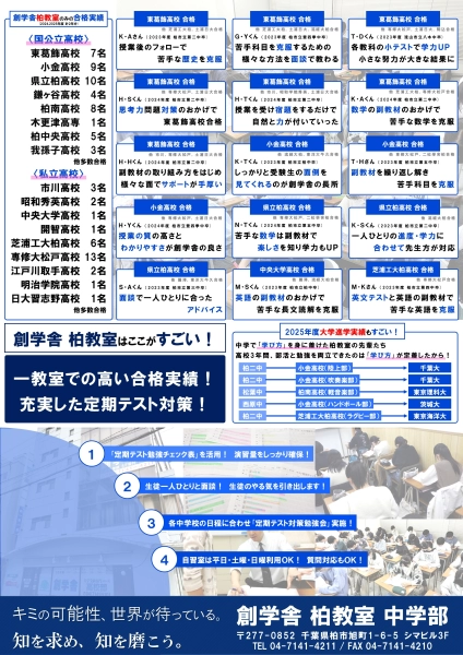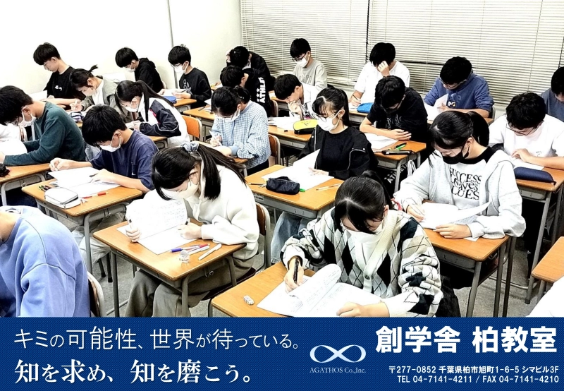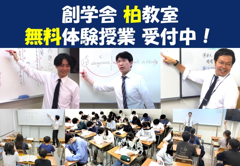 創学舎 柏教室は、小学生から中学生までのお子様にお通いいただいております。無限の可能性をもっているけれど、多感で影響も受けやすい年頃のお子様に対して、可能な限りの親身の指導を心がけております。「お子様の成長を支援する」、これが創学舎の使命です。学力の向上、志望校合格は学習塾としてもちろんのことですが、定期テストや受験勉強を通して、「学び方(授業の受け方・宿題のやり方・ワークの使い方等)」を知り、「できないことができるようになる」ことで、「学ぶこと」が楽しいと思ってもらいたいと考えています。お子様一人ひとりが、学ぶことを好きになり、自ら学び続け、受験を乗り越えて社会で力を発揮してくれることが一番の喜びです。創学舎は、学習指導・受験指導を通して次世代を担う子どもたちの自己実現に貢献することを目指す、地域に根ざした学習塾であり続けたいと考えています。
