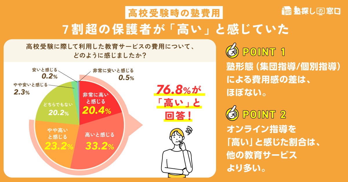 【結果概要】7割の保護者が「塾の費用を高い」と感じる結果に。塾の形態別に費用感を分析すると…?