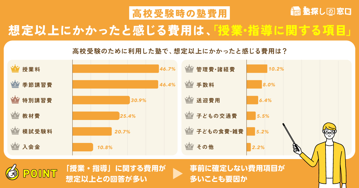 【高校受験時の塾費用】想定以上にかかったと感じる費用は、「授業・指導に関する項目」