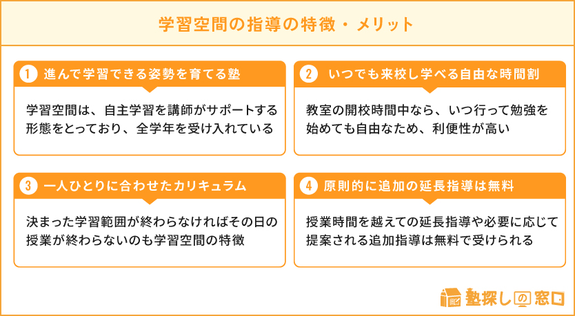 学習空間の特徴やメリット、強みを4つのポイントから解説します。お子さんに合いそうか判断するヒントにしてください。