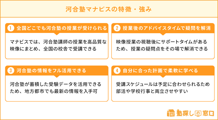 河合塾マナビスは、どのような特徴・強みを持つ塾でしょうか。4つの観点からまとめました。
