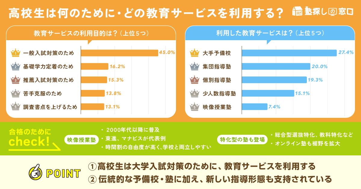 高校生は何のために・どの教育サービスを利用する?高校生の教育サービスの利用目的と、利用した教育サービスについて