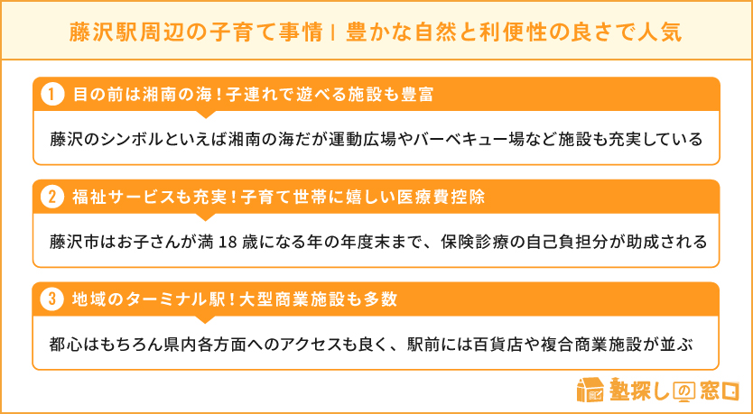はじめに、藤沢駅を中心としたエリアの子育て事情や、この地ならではの利点を見ていきましょう。