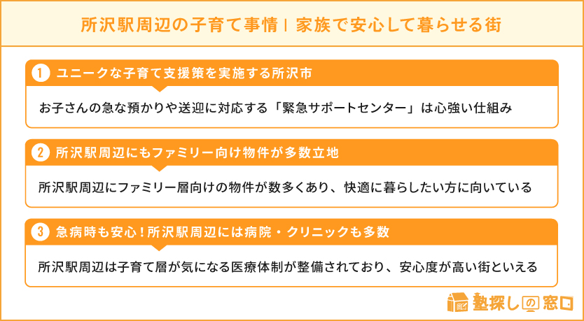 まず、所沢駅周辺で子育てをする際、気になる行政の支援や住居、医療体制について解説します。