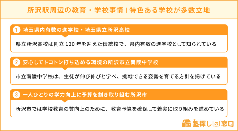 所沢市は個性的な学校が多いことでも知られます。所沢の教育事情を、3つの観点から紹介します。
