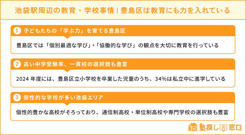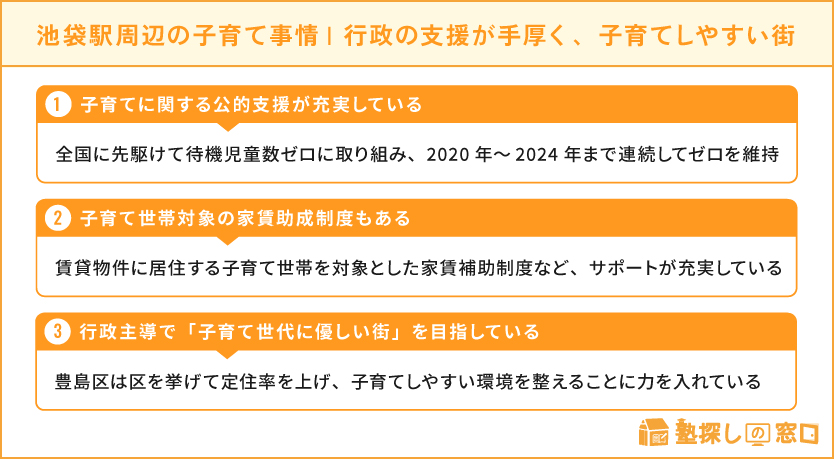 池袋駅はアクセスが良く、進路選択の幅も広い魅力的なエリアです。区の子育て支援も充実しており、親も子も安心して楽しく暮らせる街といって良いでしょう。