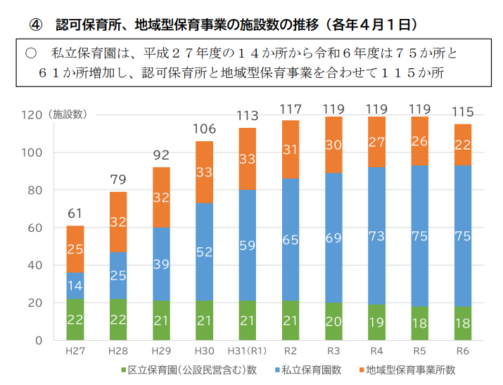 これは、豊島区が保育所数の拡充を主導してきた成果です。実際、豊島区の保育所数は私立保育園を中心に大きく増えています。