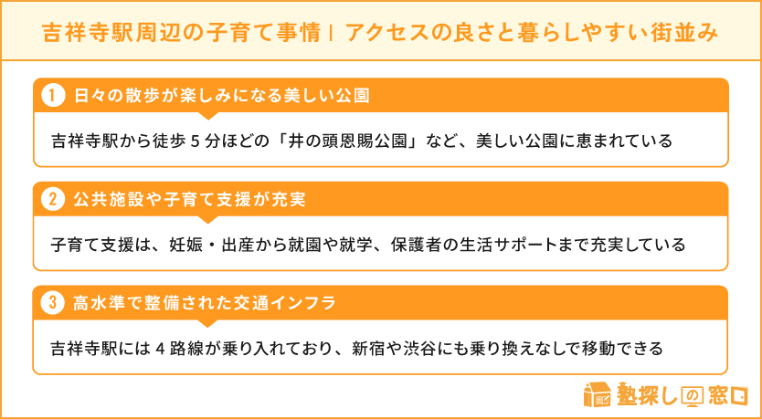 「東京の住みたい街ランキング」といった特集では、上位常連の吉祥寺。子育てや教育、おすすめ塾などについて紹介します。
