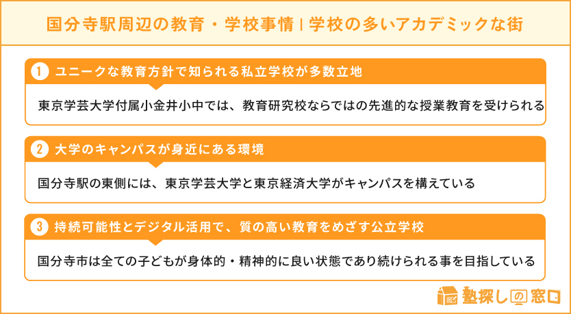 国分寺の学校教育は、どのような特徴があるでしょうか。3つの観点から解説します。