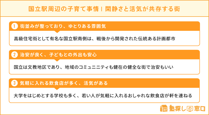 国立は、中央線沿い有数の高級住宅街としても知られるエリアです。国立の子育て・教育事情や、おすすめ塾情報などを紹介します。