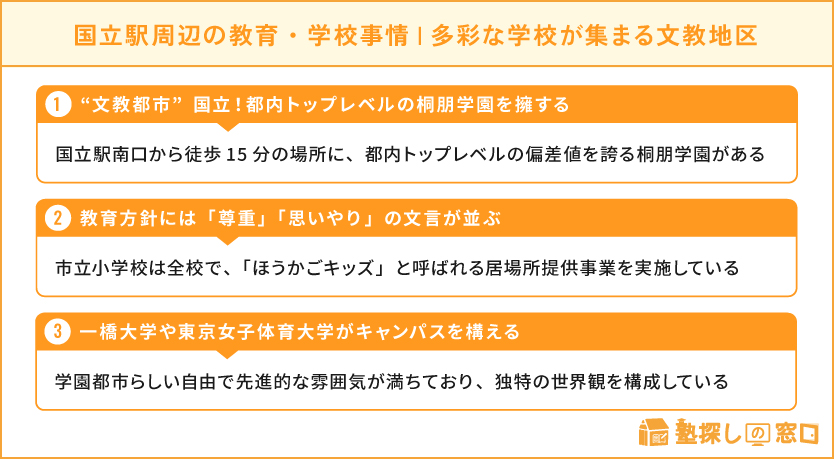 国立駅周辺の教育や学校事情は、どのようになっているでしょうか。特徴的な3つのポイントを解説します。