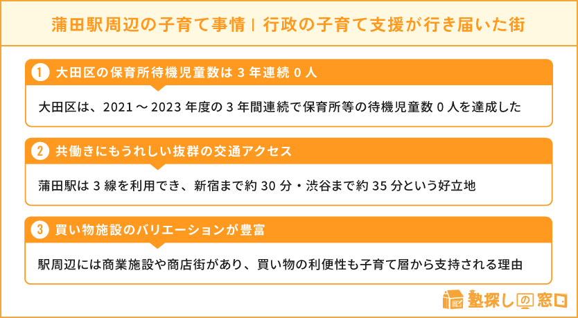 はじめに、蒲田の子育てに関する情報を解説します。「子育てしやすい街」といわれる理由は何でしょうか。