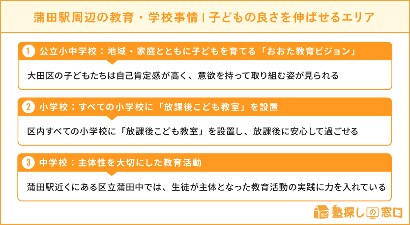 蒲田の教育や学校の特色を見てみましょう。3つの観点から解説します。