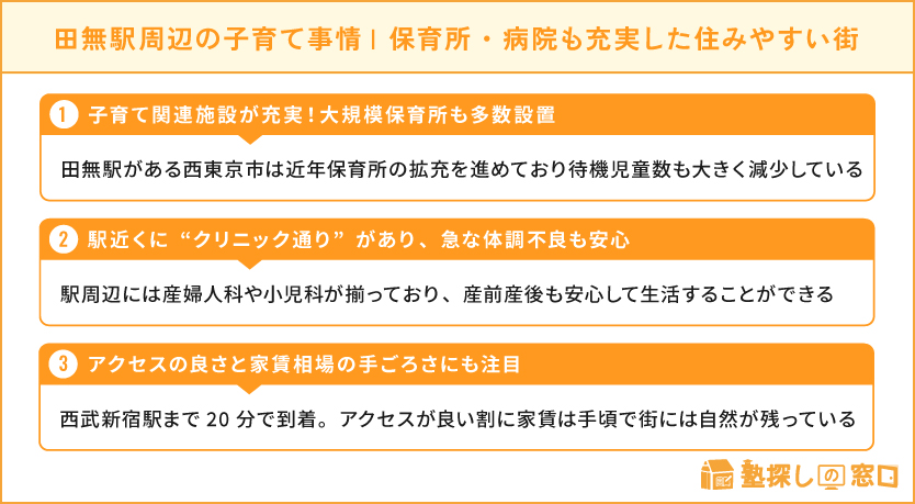 はじめに、田無エリアの子育て環境について、3つのポイントから解説します。