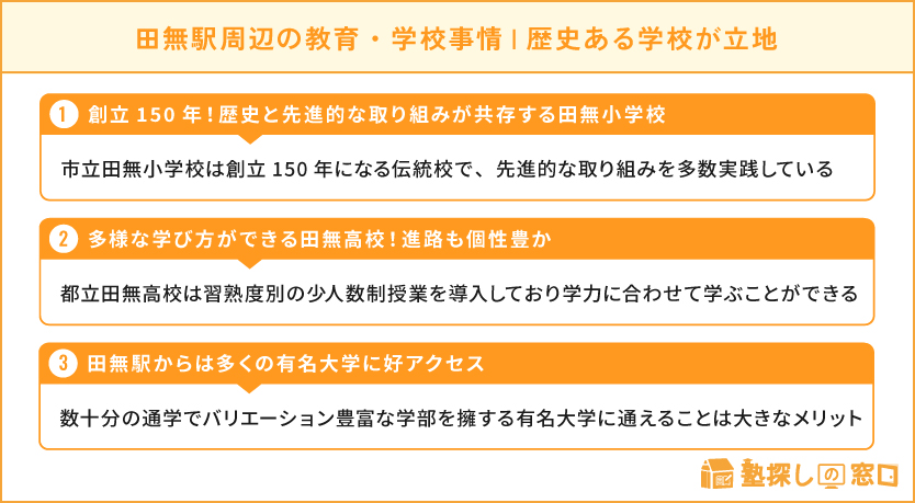 数十分の通学でバリエーション豊富な学部を擁する大学にアクセスできるのは、田無で子育てをするメリットの1つでしょう。有名大学をめざすお子さんにも、おすすめできるエリアです。